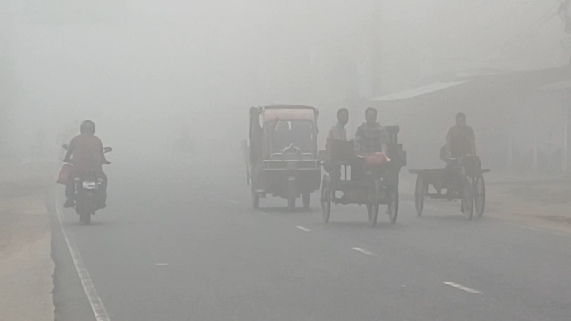 নওগাঁয় ঘন কুয়াশা জানান দিচ্ছে শীতের আগমনী বাতা