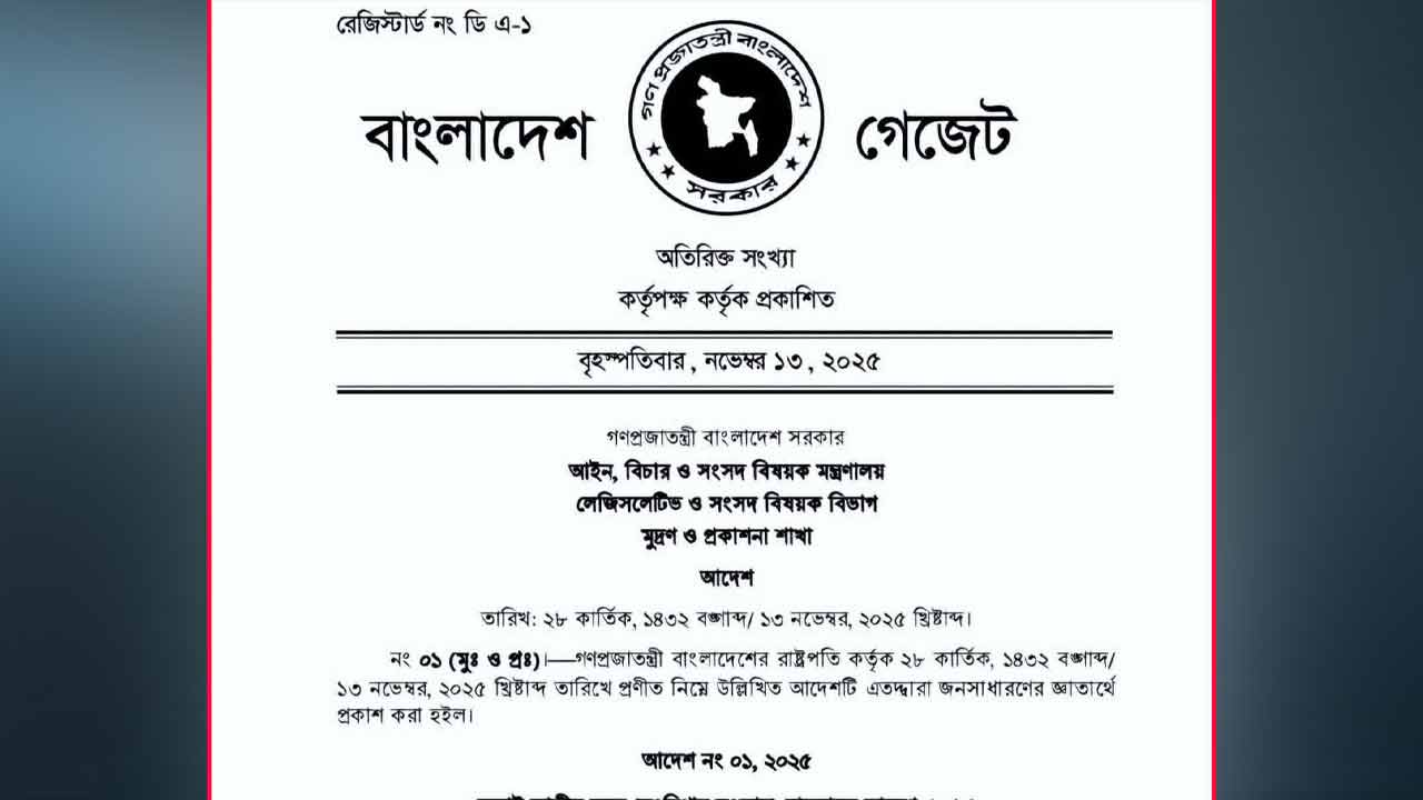 জাতীয় সংবিধান (সংবিধান সংস্কার) বাস্তবায়নের জন্য ২০২৫ সালের জুলাই মাসে সরকার একটি গেজেট প্রকাশ করেছে। বৃহস্পতিবার (১৩ নভেম্বর) রাষ্ট্রপতি মো.