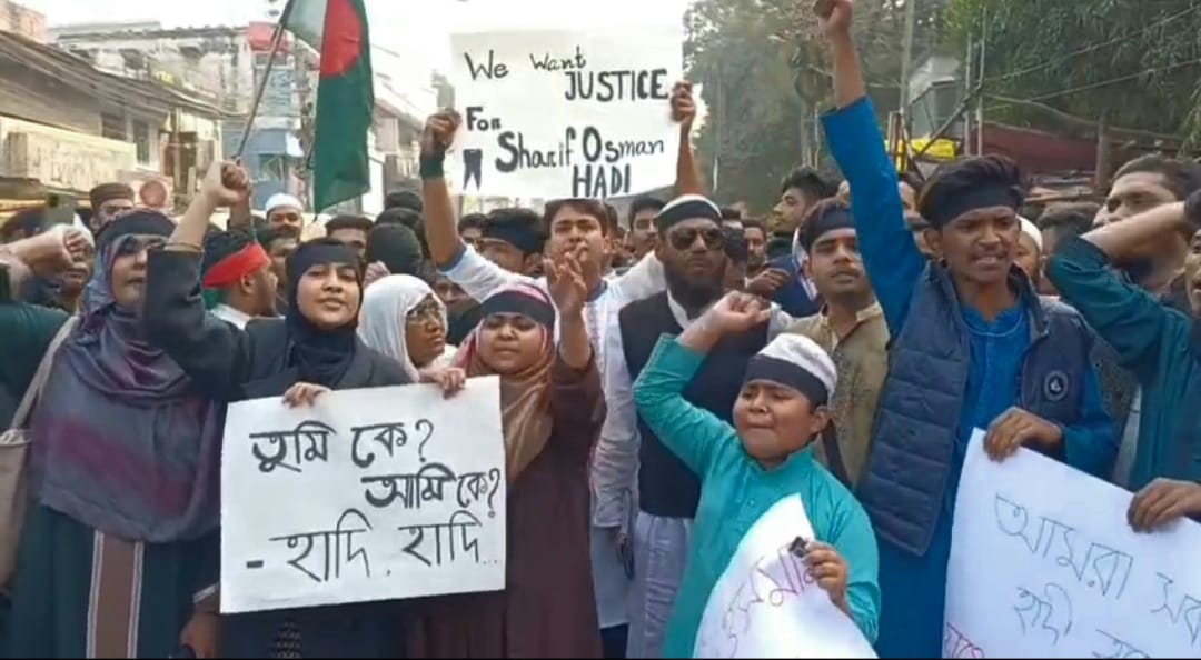 ওসমান হাদির হত্যার প্রতিবাদে নওগাঁয় ছাত্র-জনতার কফিন মিছিল