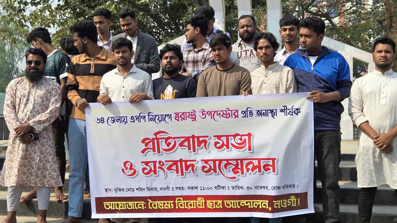 ৬৪ জেলায় নতুন পুলিশ সুপার (এসপি) নিয়োগের বিষয়ে স্বরাষ্ট্র উপদেষ্টার প্রতি অবিশ্বাস প্রকাশ করে নওগাঁয় মানববন্ধন এবং প্রতিবাদ সভা করেছে