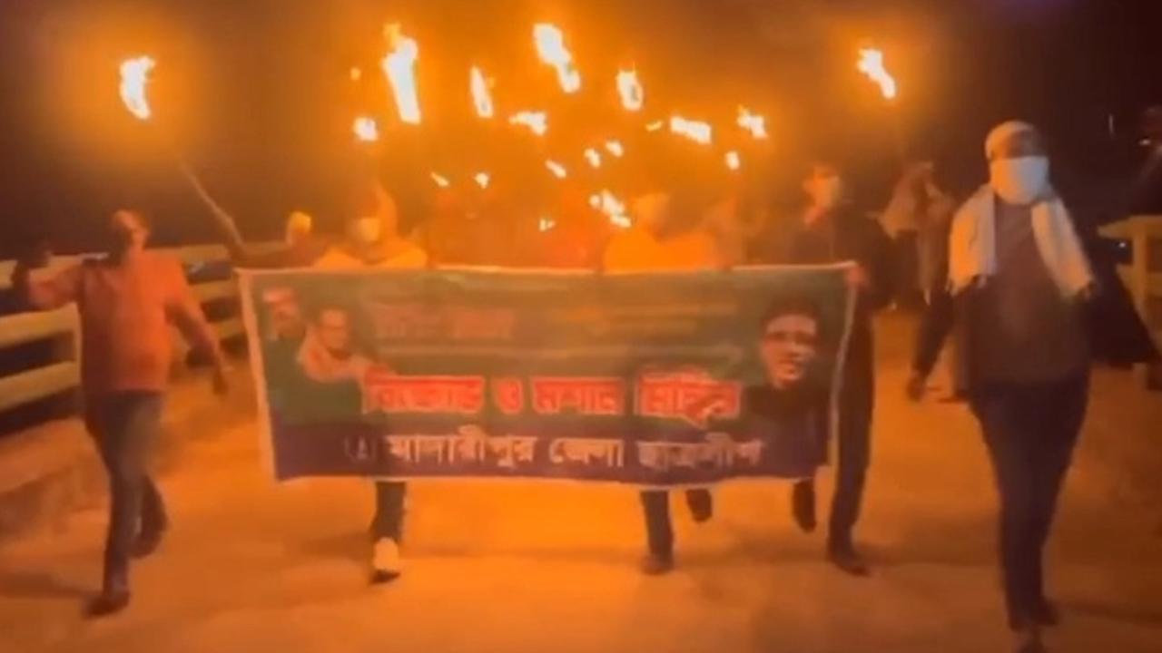 জুলাই গণঅভ্যুত্থানের সময় সংঘটিত মানবতাবিরোধী অপরাধে সাবেক প্রধানমন্ত্রী শেখ হাসিনাকে মৃত্যুদণ্ড দেওয়ার প্রতিবাদে মাদারীপুরে নিষিদ্ধ ঘোষিত ছাত্রলীগের একটি মশাল মিছিল